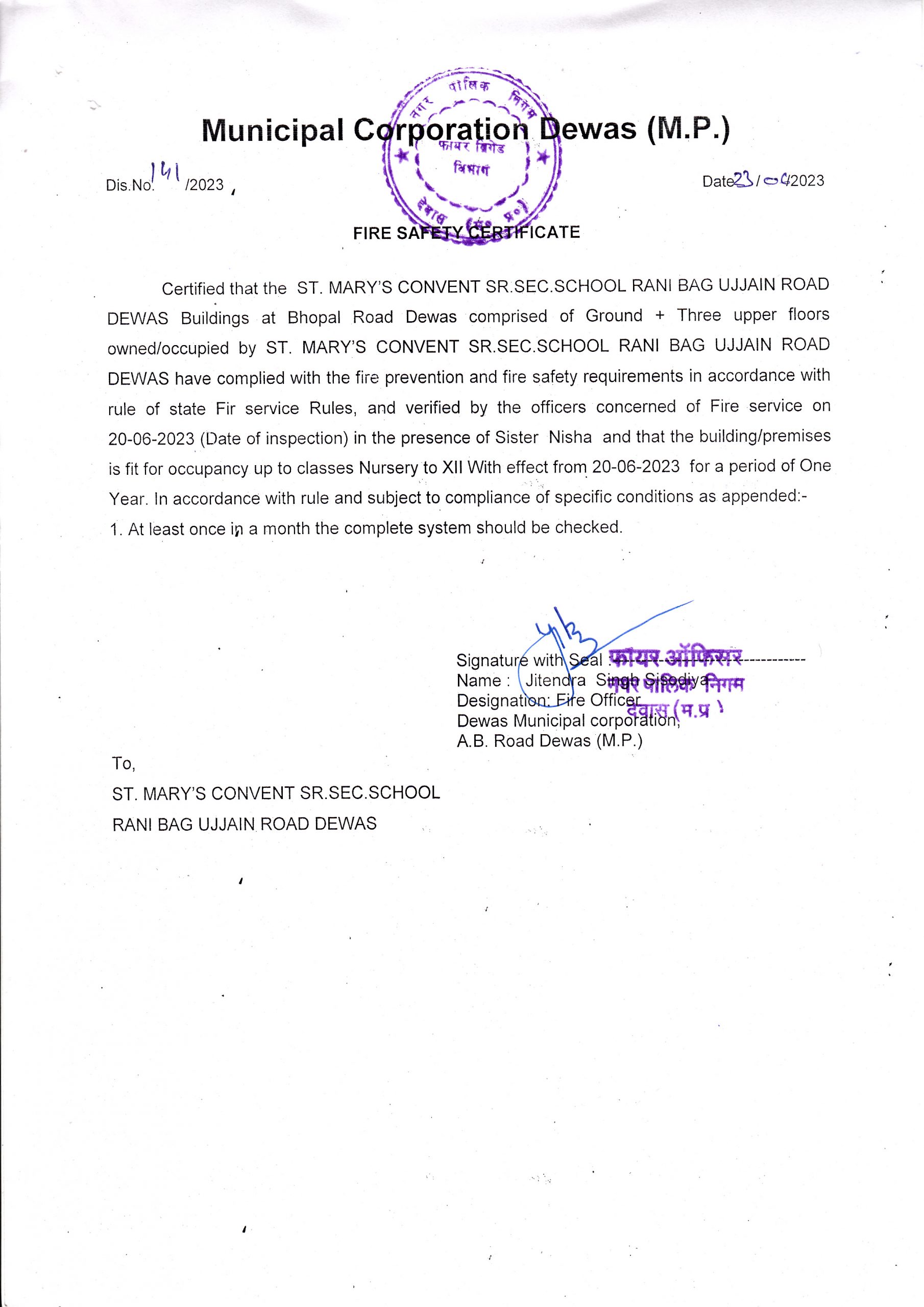 | 6 | COPY OF VALID FIRE SAFETY CERTIFICATE ISSUED BY THE COMPETENT AUTHORITY | VIEW |