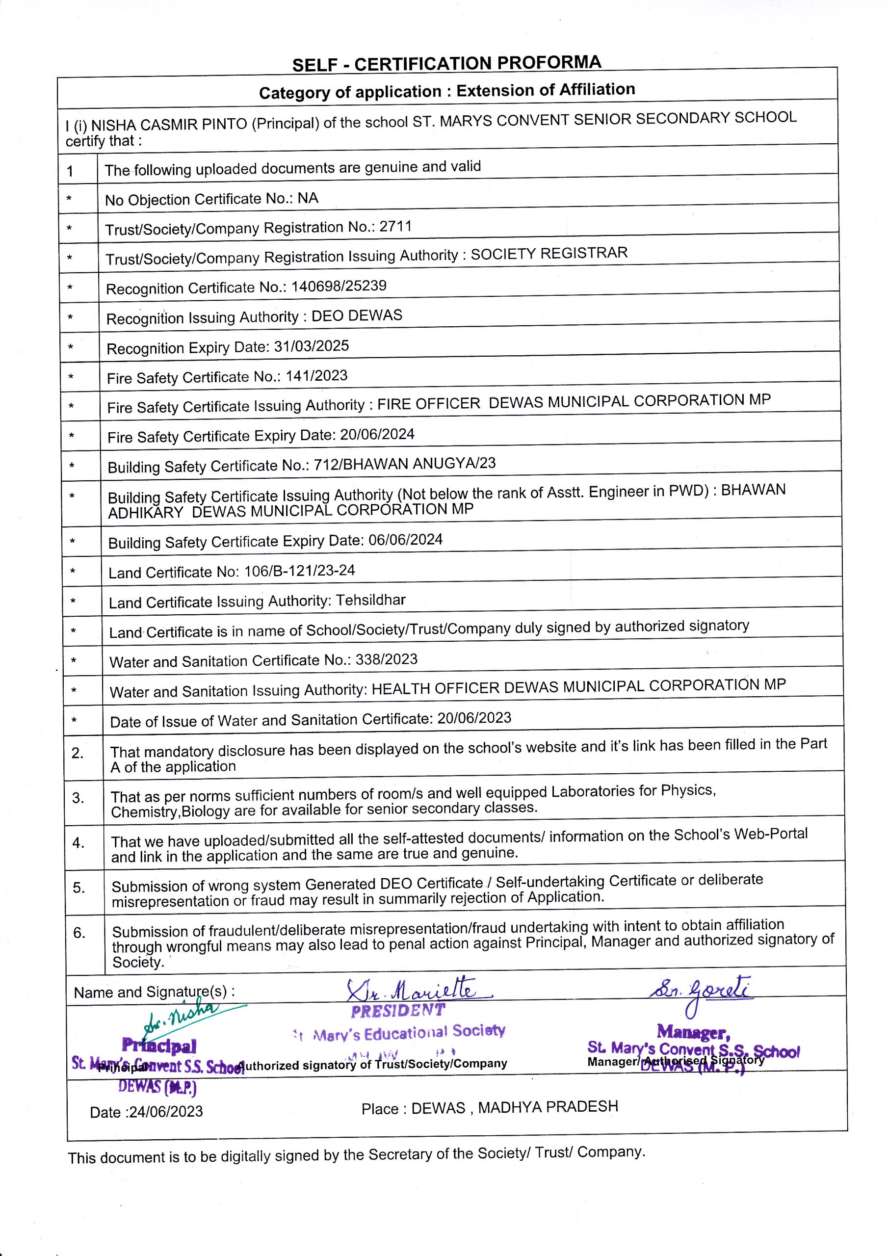 | 7 | COPY OF THE SELF CERTIFICATION SUBMITTED BY THE SCHOOL FOR AFFILIATION/UPGRADATION/EXTENSION OF AFFILIATION | VIEW |